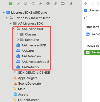 Download the AAILivenessSDK, AAILivenessModel, AAINetwork, AAICore, AAIDataVisor then uncompress them and add AAILivenessSDK folder, AAILivenessModel.xcframework, AAINetwork.xcframework, AAICore.xcframework, AAIDataVisor.xcframework to your project:
